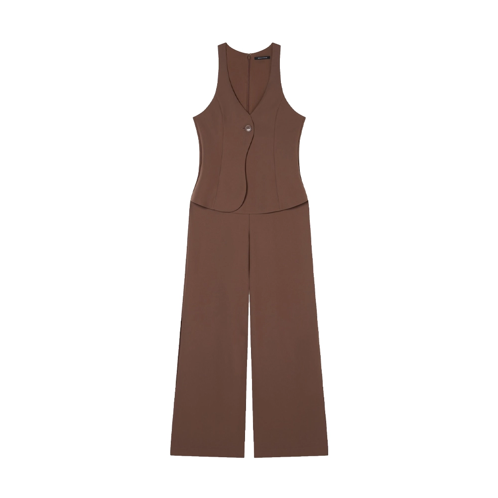 Elegante e contemporanea, questa tuta Armani Exchange combina linee sartoriali e design moderno in un unico capo raffinato. Il modello è caratterizzato da un gilet senza maniche con scollo a V, che valorizza la silhouette con una linea pulita e femminile. La parte superiore presenta una chiusura frontale con bottone e una costruzione strutturata che definisce il punto vita, mentre i pantaloni a gamba ampia completano il look con un effetto fluido ed elegante. La chiusura con zip sul retro assicura una vestibilità pratica e confortevole.