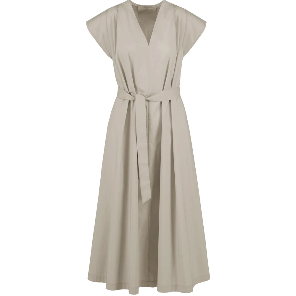Inoltre, l’abito è impreziosito da una cintura in vita che definisce la silhouette e aggiunge un tocco di grazia e raffinatezza. Questa cintura non solo accentua la vita, ma aiuta anche a creare proporzioni armoniose e un look più strutturato e curato.