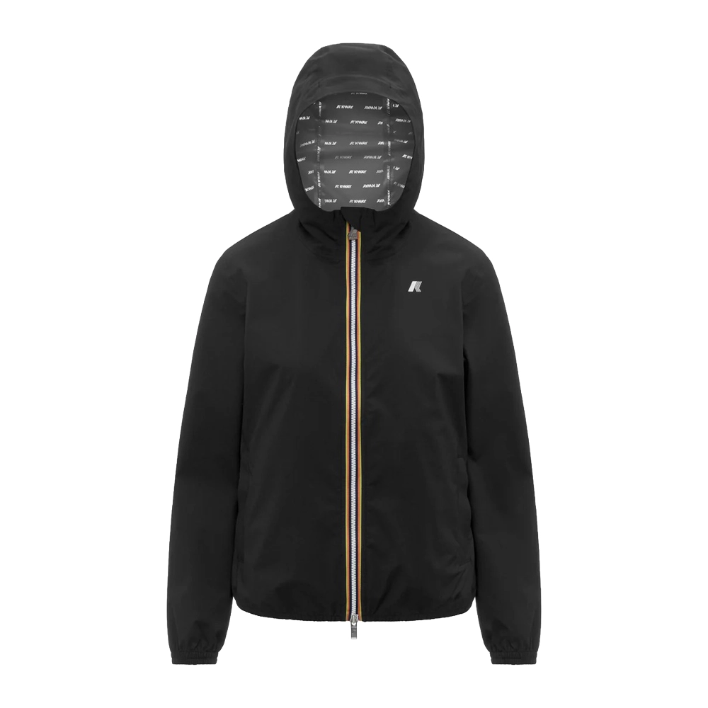 Lil è una giacca corta da donna ideale per la mezza stagione. Realizzata in tessuto tecnico elasticizzato con membrana isolante e fodera stampata all over con lettering K-Way argento, offre libertà di movimento e protezione da vento e pioggia, con una resistenza all’acqua fino a 10.000 mm di colonna d’acqua. Il capo presenta cappuccio rimovibile e polsini e orlo elasticizzati per una vestibilità confortevole.