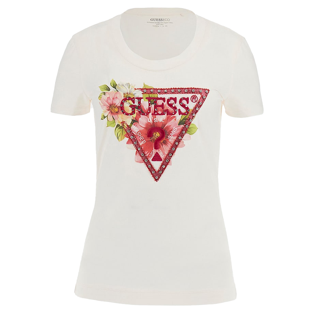 Il design presenta una vestibilità slim che valorizza la silhouette femminile senza sacrificare il comfort. Il logo triangolo Guess è impreziosito da perline scintillanti, aggiungendo un tocco di originalità e raffinatezza al capo. La tonalità Cream White conferisce un aspetto pulito e sofisticato, facilmente abbinabile a vari stili e occasioni.