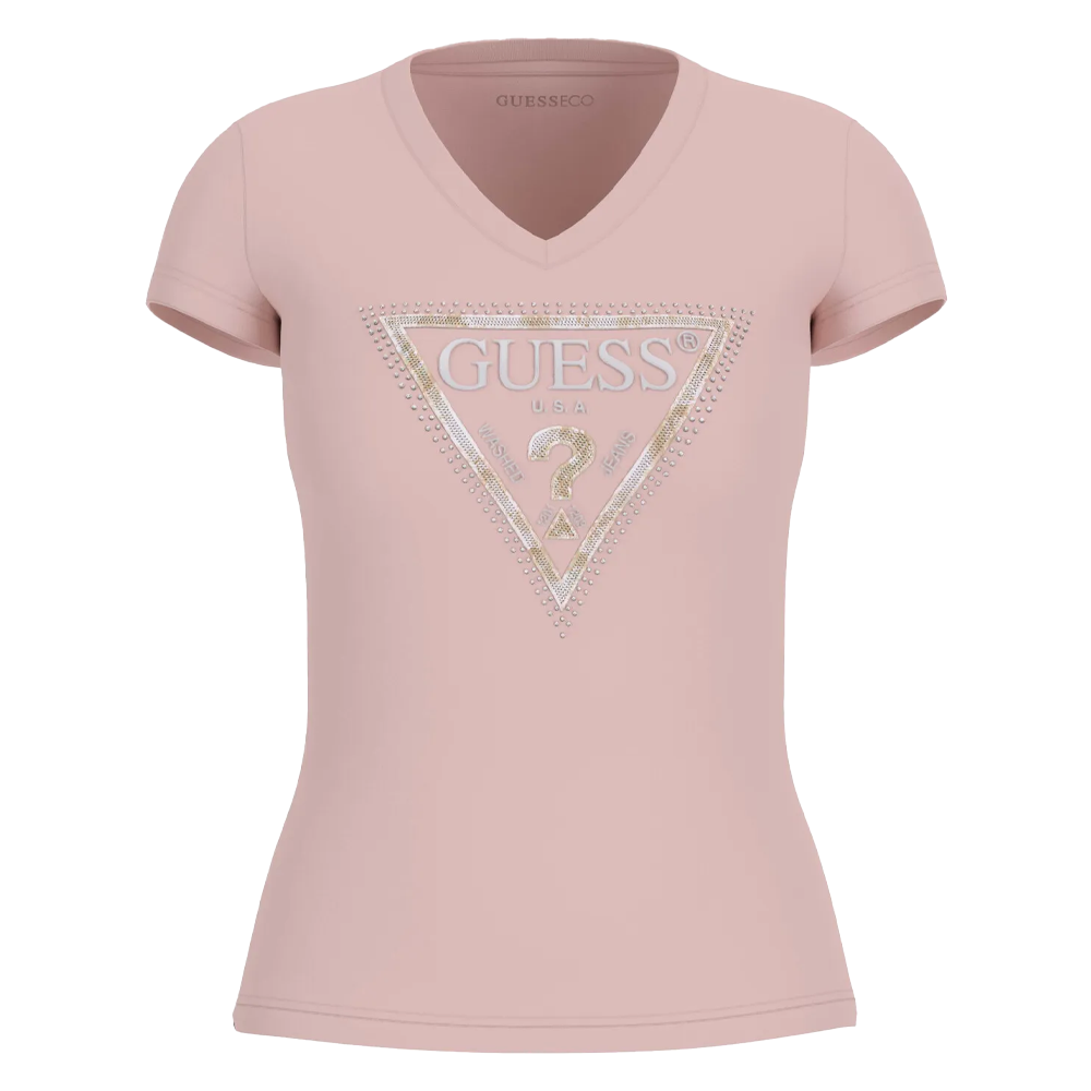 Il design presenta un scollo a V e maniche corte, elementi che aumentano la sua versatilità e facilità di abbinamento. Il punto focale è il logo triangolo Guess con una stampa effetto pitone, che aggiunge un tocco di originalità e femminilità al capo.