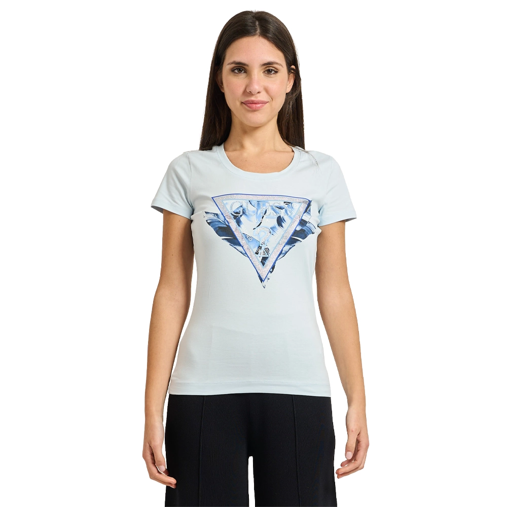 T-shirt girocollo Guess donna con logo triangolo sul davanti, realizzata in cotone.