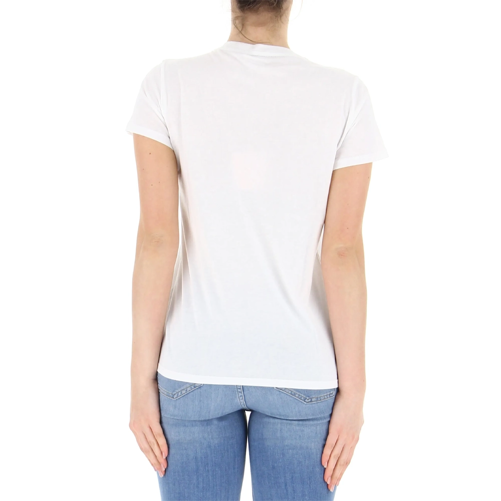 La t-shirt Liu Jo in cotone a maniche corte con scollo a V e stampa logata con strass sul petto è un capo must-have per chi desidera unire stile e comfort. Perfetta per ogni occasione, questo capo versatile e di alta qualità è un investimento che arricchirà il tuo guardaroba con eleganza e femminilità.