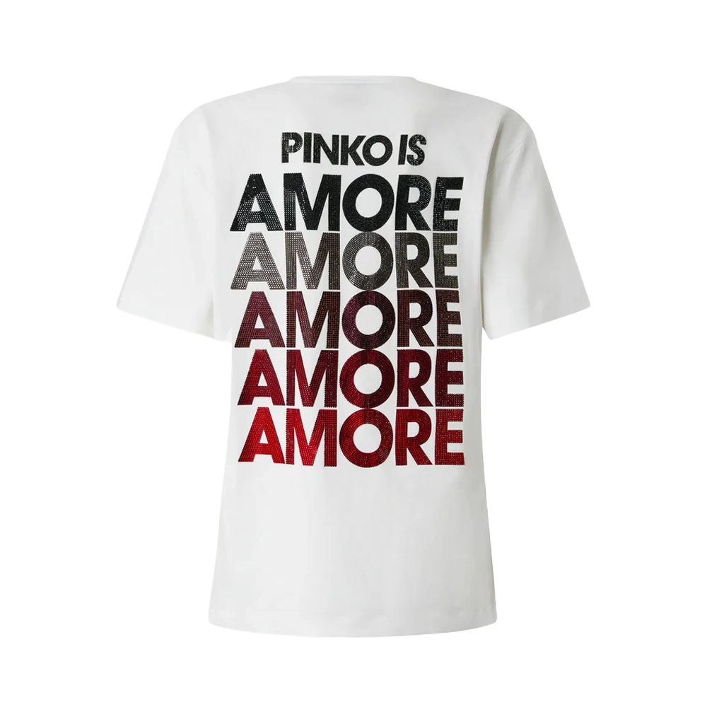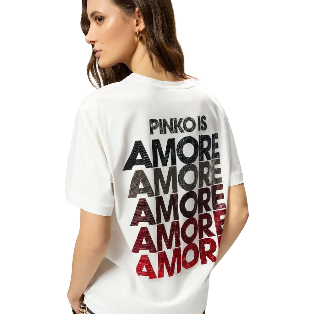 T-shirt girocollo a maniche corte realizzata in morbido jersey di cotone. Il modello si caratterizza per il maxi lettering PINKO IS AMORE multicolor dégradé in strass sul retro e per il logo lettering PINKO che forma un piccolo cuore, sempre in strass, sul petto. Un capo basico reinterpretato in chiave PINKO, da indossare con un paio di jeans o con i tuoi pantaloni preferiti per un look glamour e originale.
