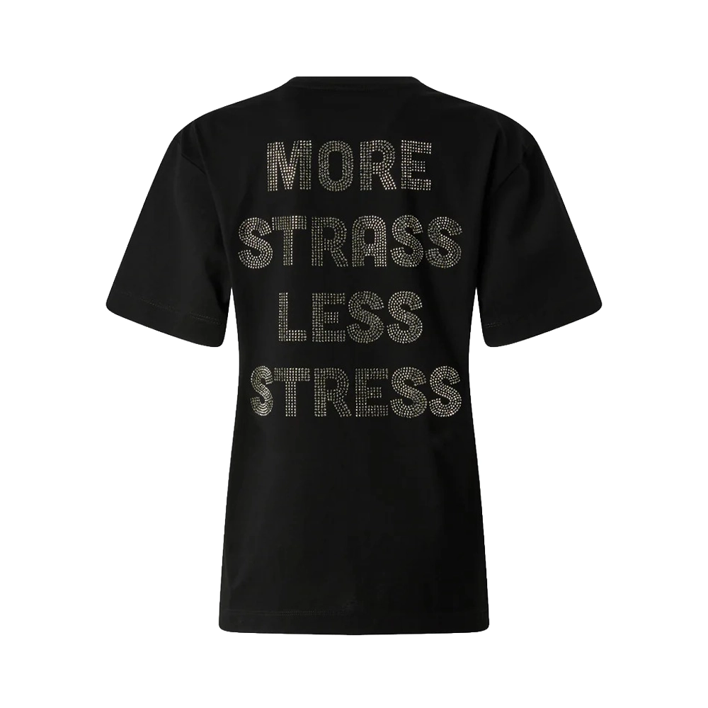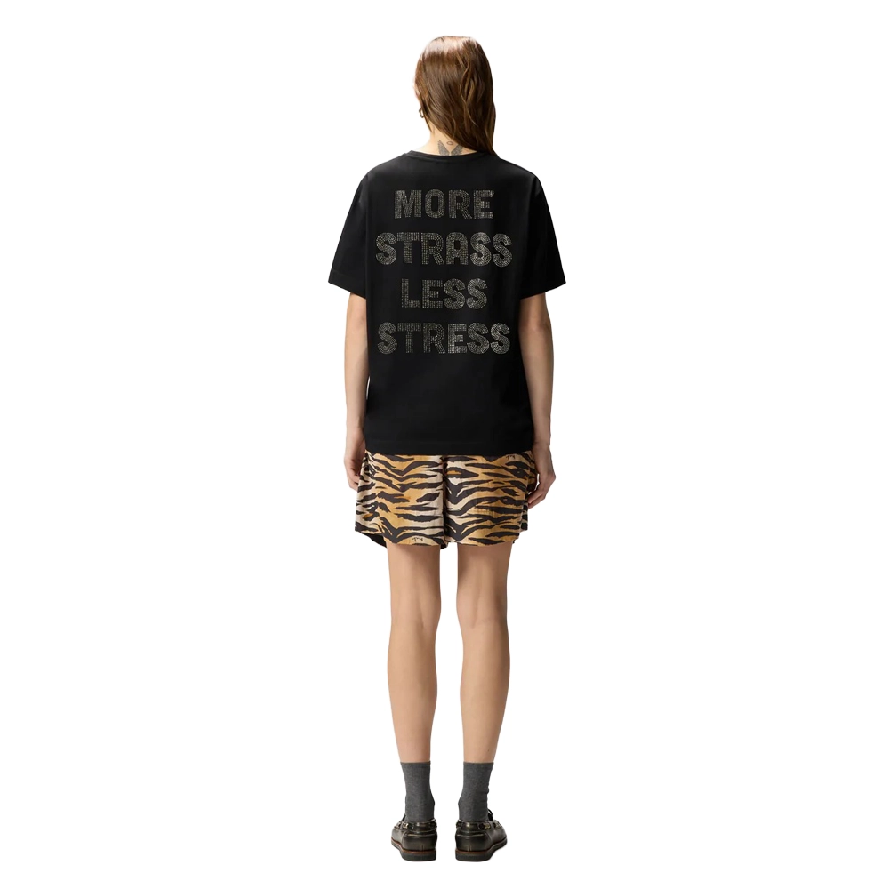T-shirt girocollo a maniche corte realizzata in jersey di puro cotone. Il modello è caratterizzato dal logo lettering PINKO impreziosito da strass sul petto, e da un maxi lettering More Strass Less Stress, sempre composto di strass, sul retro. Un capo imprescindibile del guardaroba femminile rivisitato in chiave PINKO, per elevare anche i tuoi look di tutti i giorni.