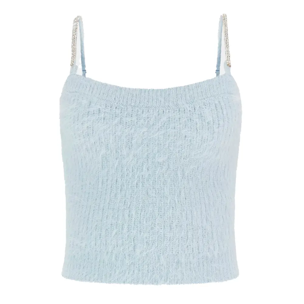 Il Top con Strass Keyla Azzurro di GUESS è un capo che combina stile, comfort e versatilità. La cura nei dettagli, come le spalline con strass e il filato fuzzy, lo rendono un’aggiunta preziosa al guardaroba di ogni donna attenta alla moda. Che sia per una serata elegante o per un’uscita informale, questo top saprà valorizzare ogni outfit con un tocco di classe.