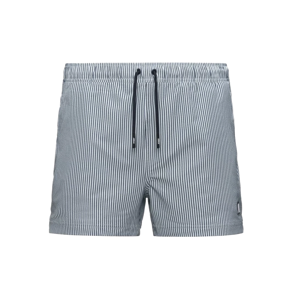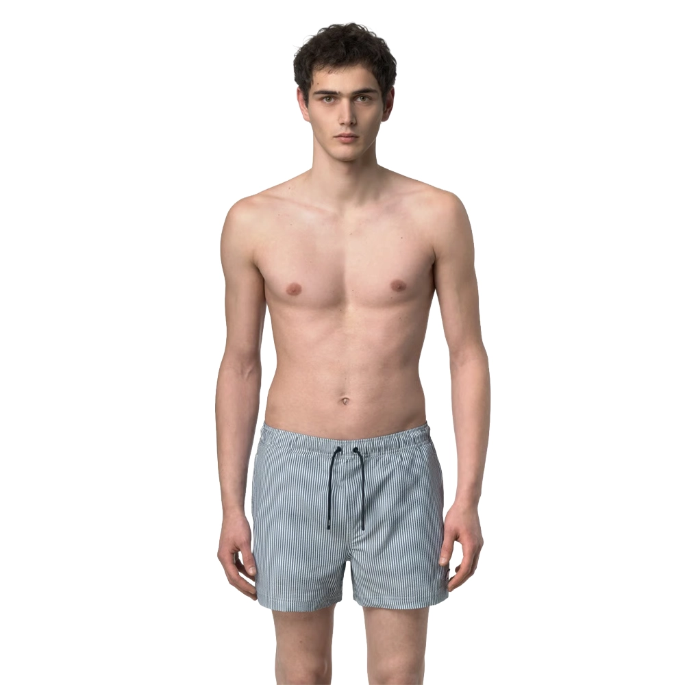 Hazel è un costume da bagno da uomo modello boxer corto dal design essenziale e versatile. Il costume presenta due tasche laterali e una sul retro, con il dettaglio grafico del tape K-Way. Realizzato in tessuto seersucker con motivo a righe ad asciugatura rapida, presenta inserto elastico in vita, slip interno in rete e spacchetti laterali che garantiscono massima libertà di movimento.