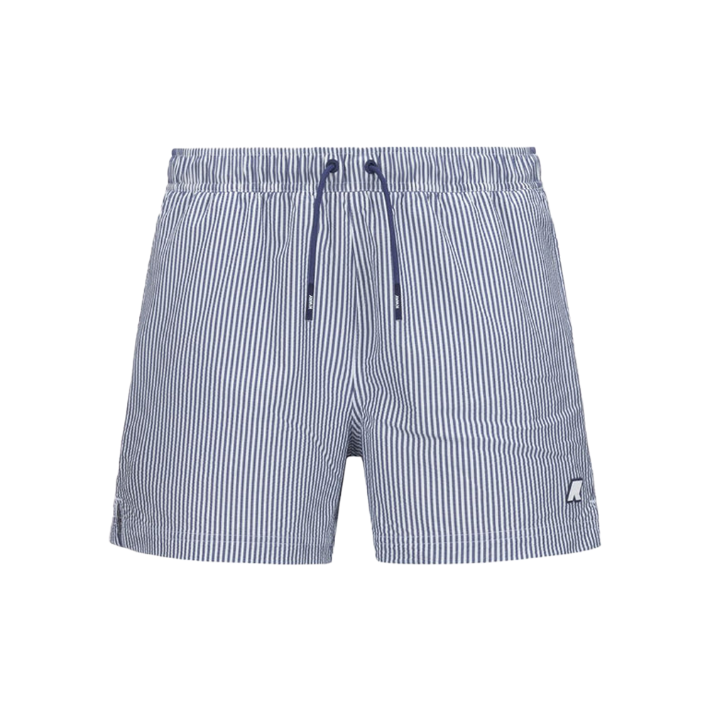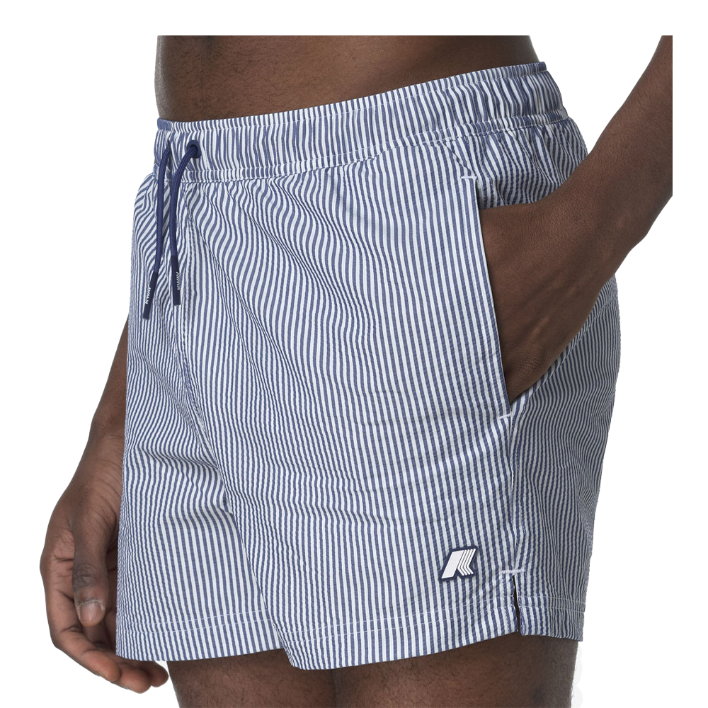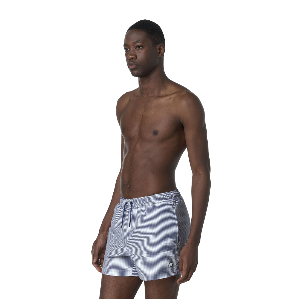 Il motivo a righe bianche e blu profondo conferisce un aspetto classico e marinaro, facilmente abbinabile a diversi outfit estivi. Il tape K-Way aggiunge un tocco distintivo al design, richiamando l’identità del brand.