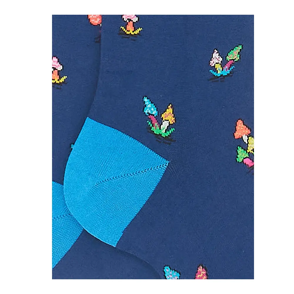 Calze lunghe da uomo realizzate in Italia in morbido cotone leggero. L’iconica fantasia funghi, su base blu inglese con fascetta a contrasto, rende queste calze un vero accessorio di stile. Il brand Gallo è ricamato in punta.