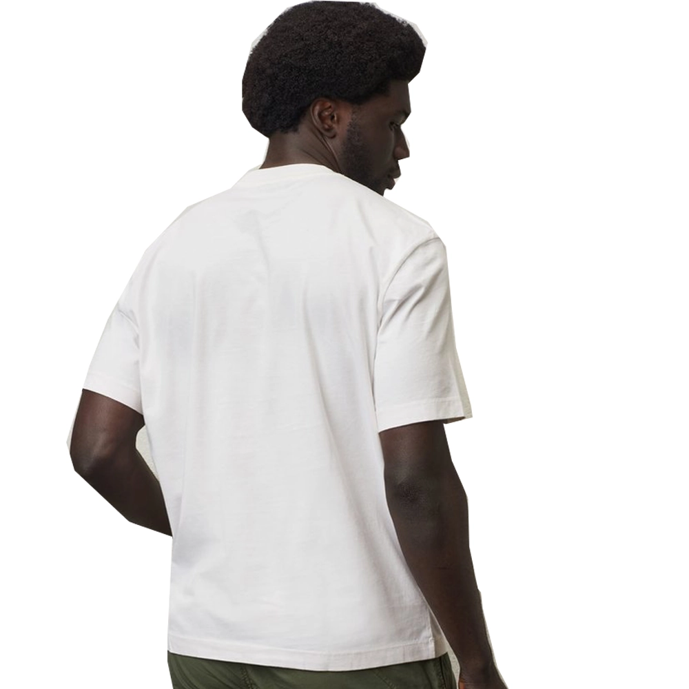 Il girocollo a costina aggiunge un tocco di classicità al design della t-shirt, conferendo un aspetto pulito e ordinato al collo. Questo dettaglio sottile ed elegante completa il look della t-shirt senza rubare la scena alla patch distintiva sul petto.