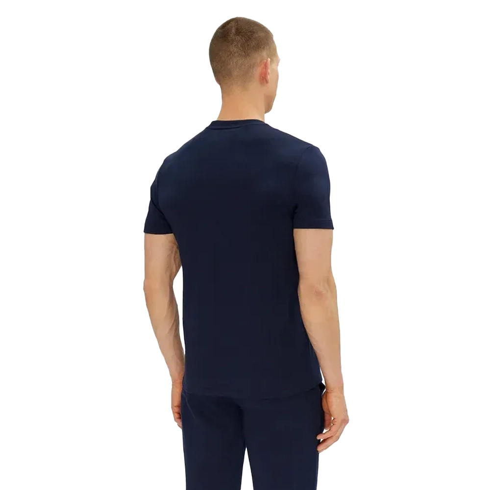 Il colore navy della t-shirt conferisce un aspetto sobrio e raffinato, facilmente abbinabile con pantaloni casual o jeans. Il logo ricamato sul petto, simbolo di alta qualità e stile, è posizionato in modo discreto ma visibile, dando al capo un tocco distintivo. Il girocollo classico e il taglio regolare ne fanno un capo comodo e versatile, adatto a tutte le fasi della giornata.