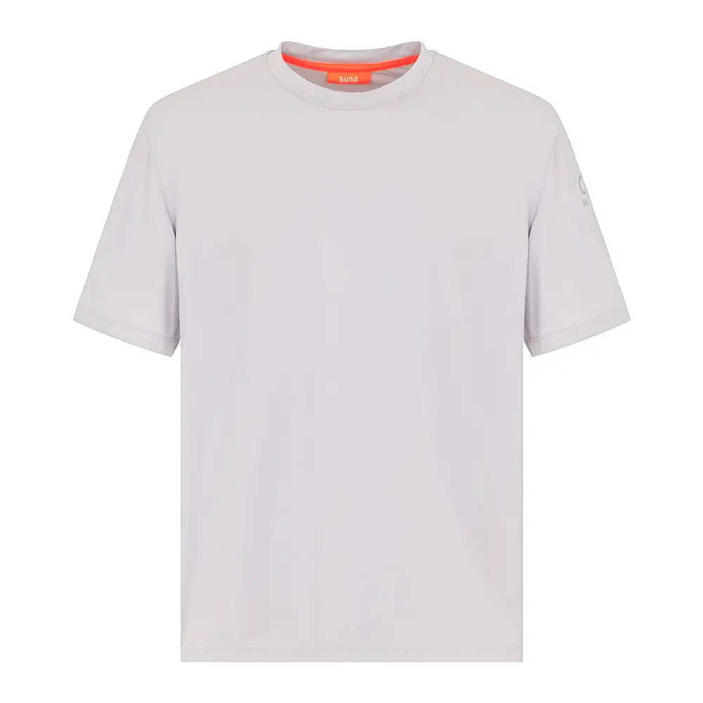 Il logo SUNS sulla manica sinistra aggiunge un tocco di stile discreto ma distintivo, conferendo alla maglietta un look moderno e alla moda. Questo dettaglio aggiunge un elemento di design che si distingue senza essere eccessivamente vistoso, perfetto per coloro che apprezzano la sottigliezza nell’eleganza.