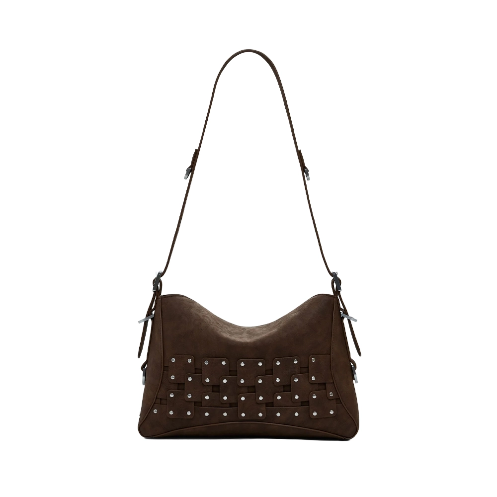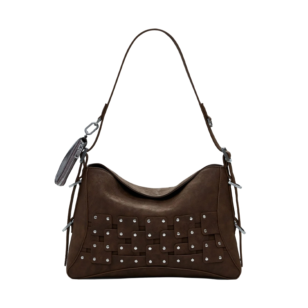 Borsa a mano stile patchwork, in tessuto effetto pelle, con dettaglio di borchie metalliche, manico regolabile e dettaglio di portamonete estraibile.