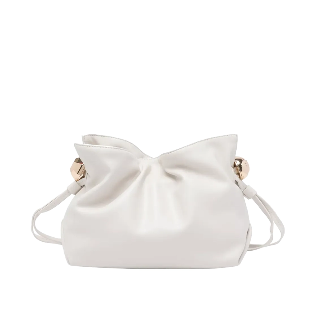 Compatta, scolpita, inconfondibile, questa piccola Riccy Bag trasforma la morbidezza in una dichiarazione di stile. Volumi pieni che si stringono in un’arricciatura a coulisse, dettagli bold che tracciano la silhouette con un rigore quasi architettonico. Perfetta anche crossbody grazie alla tracolla chain removibile.