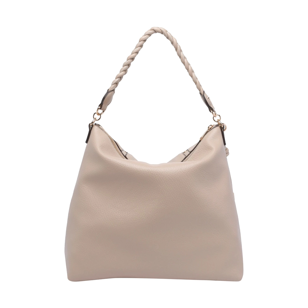 Realizzata in materiale effetto pelle con texture raffinata, presenta un manico intrecciato impreziosito da dettagli metallici dorati e una nappina decorativo. Il logo frontale in metallo aggiunge un tocco distintivo, mentre le cuciture verticali donano struttura e stile. Capiente e versatile, è ideale per accompagnare look quotidiani o serate più formali. Perfetta per aggiungere un tocco elegante a ogni outfit, da giorno o da sera.