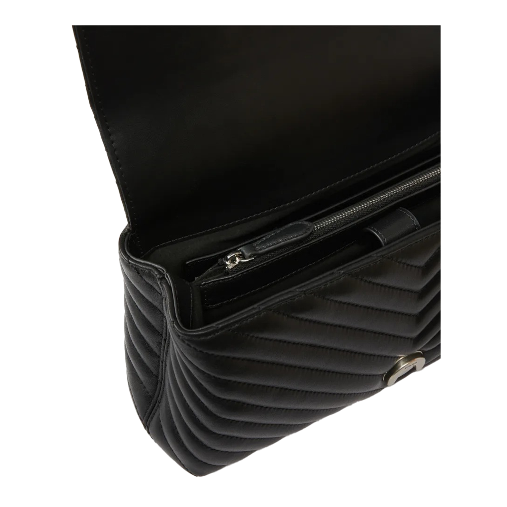 La tracolla combina una catena metallica rotonda con un pratico spallaccio regolabile in pelle, offrendo versatilità nel modo di indossarla. Le dimensioni della borsa sono 27 cm in larghezza, 12 cm in altezza e 7 cm in profondità, rendendola spaziosa ma compatta per l’uso quotidiano. Il colore nero conferisce un aspetto classico e versatile, facilmente abbinabile a diversi outfit.