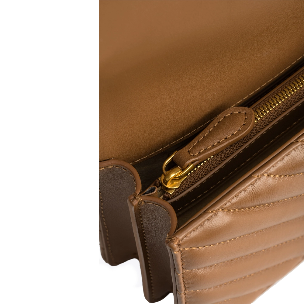 Mini Love Bag One in nappa trapuntata con motivo chevron. La chiusura è completata dall’iconica fibbia in metallo Love Birds Diamond Cut in metallo. L’interno è foderato in microfibra scamosciata e comprende tramezza chiusa con zip e tasca a parete in pelle. La tracolla combina la classica catena rotonda al pratico spallaccio in pelle regolabile.