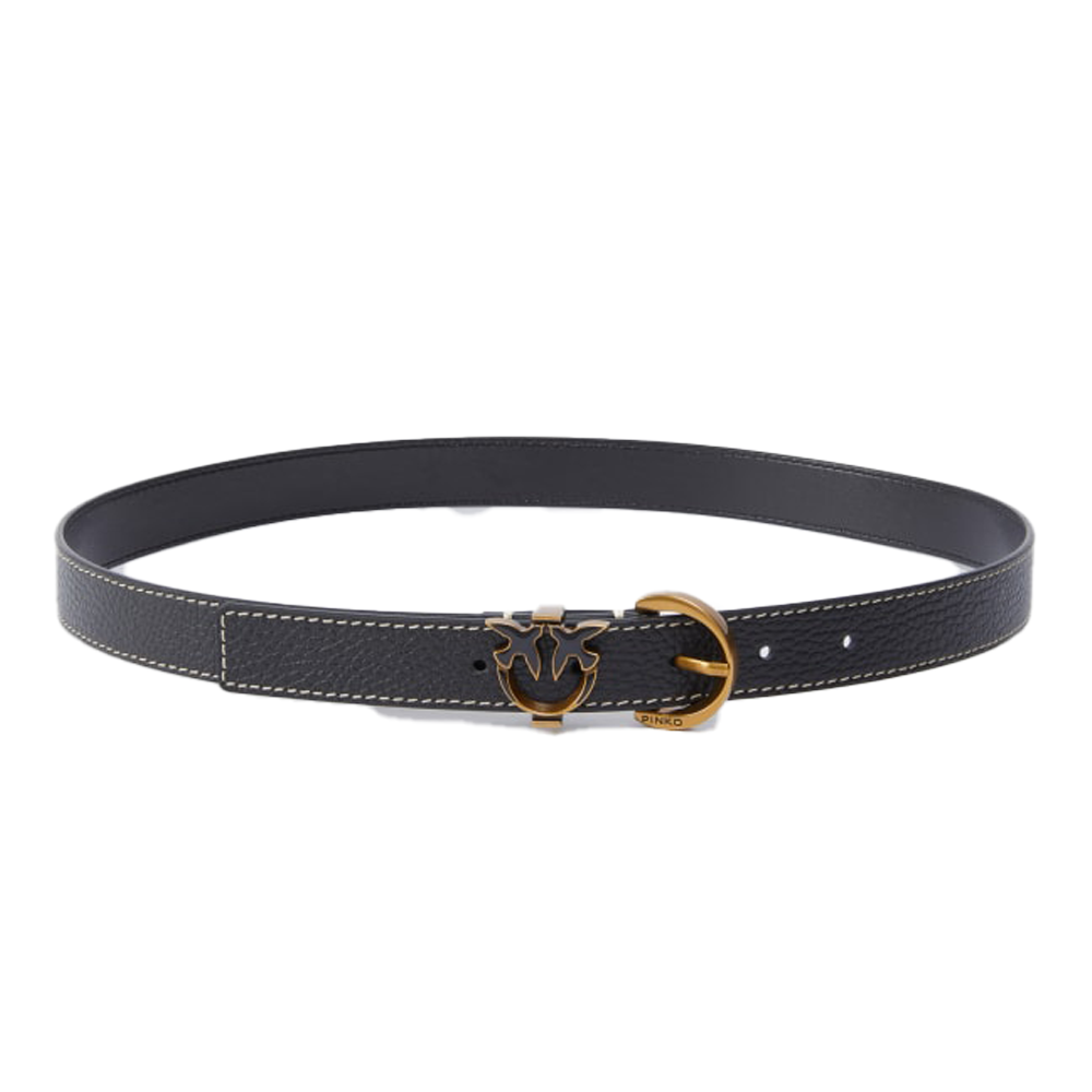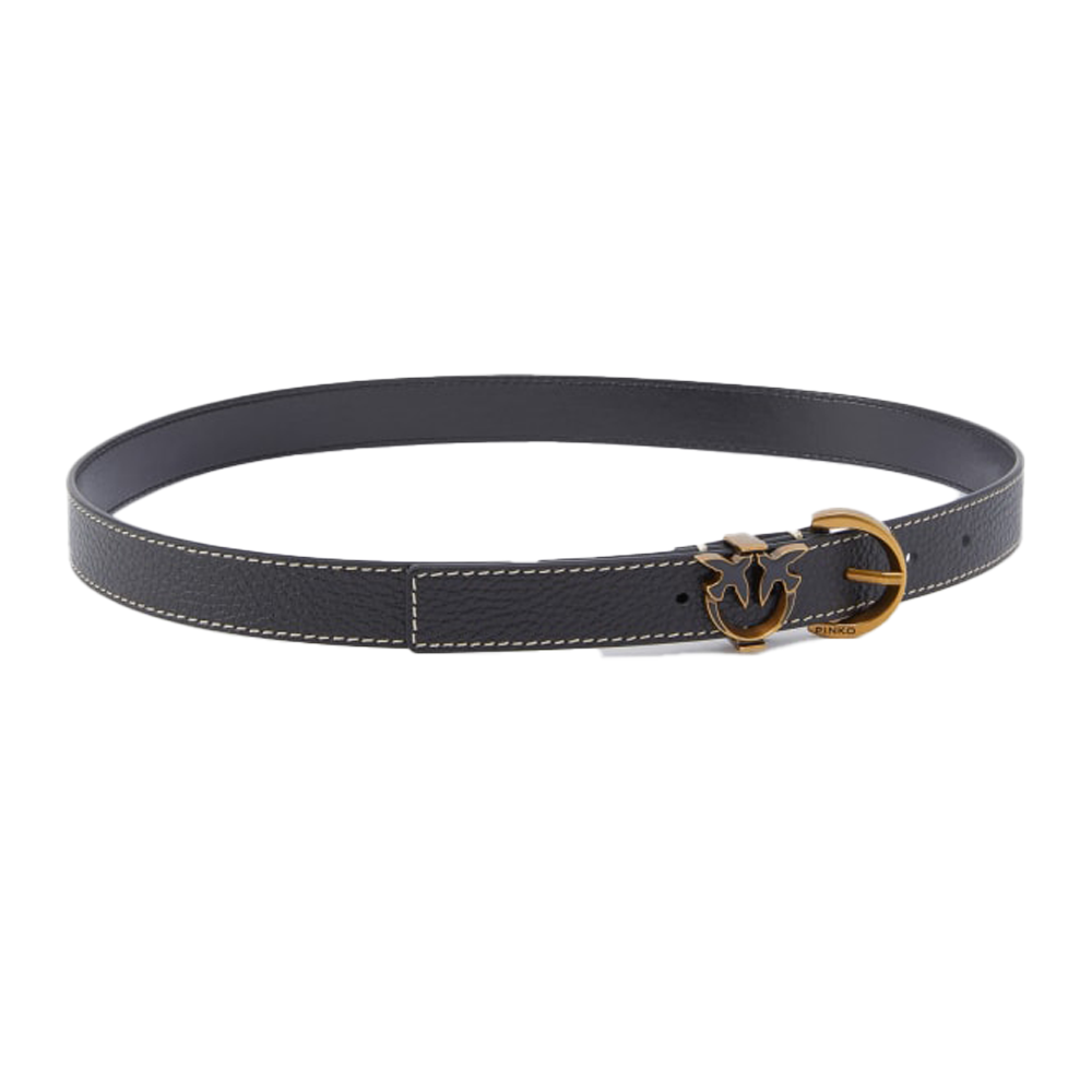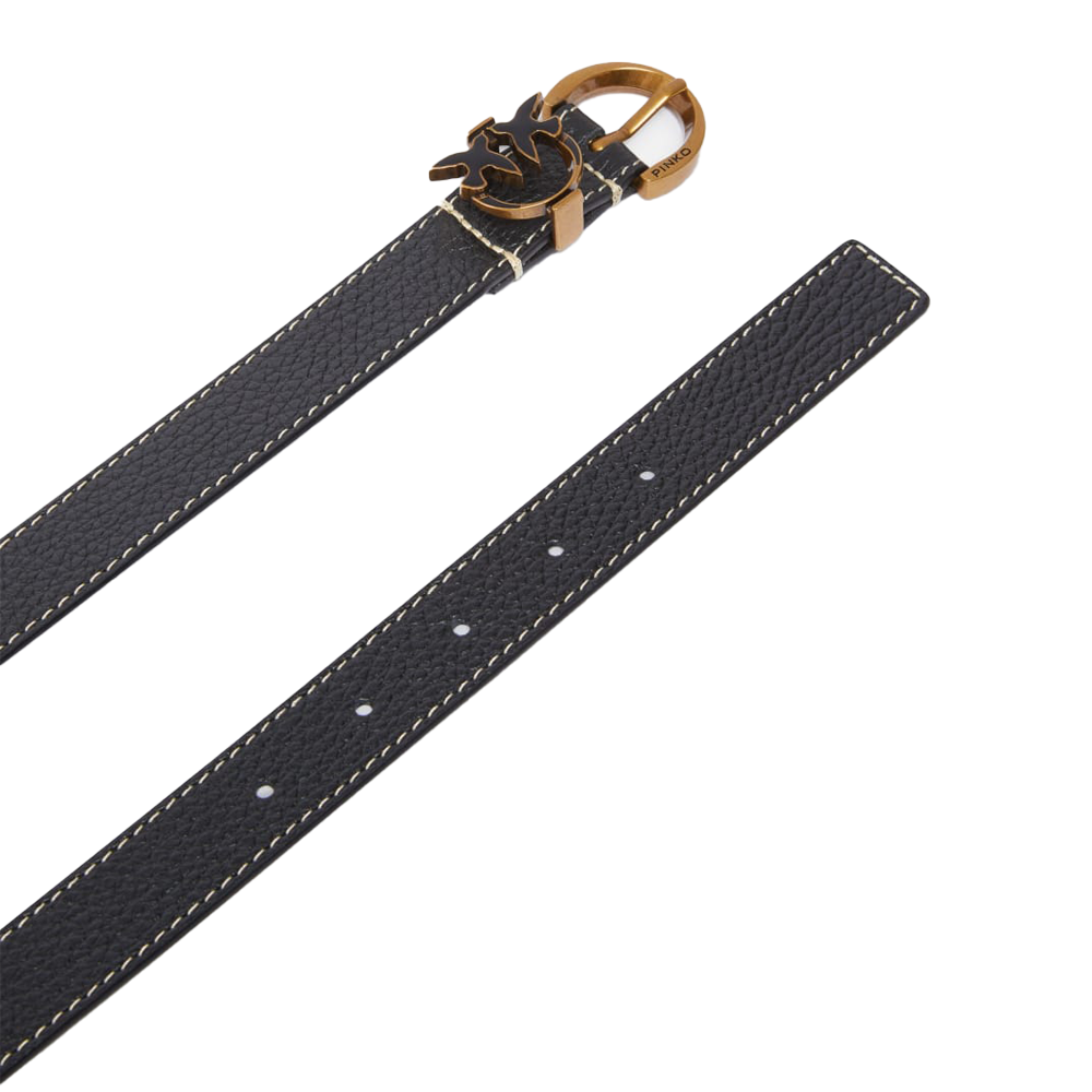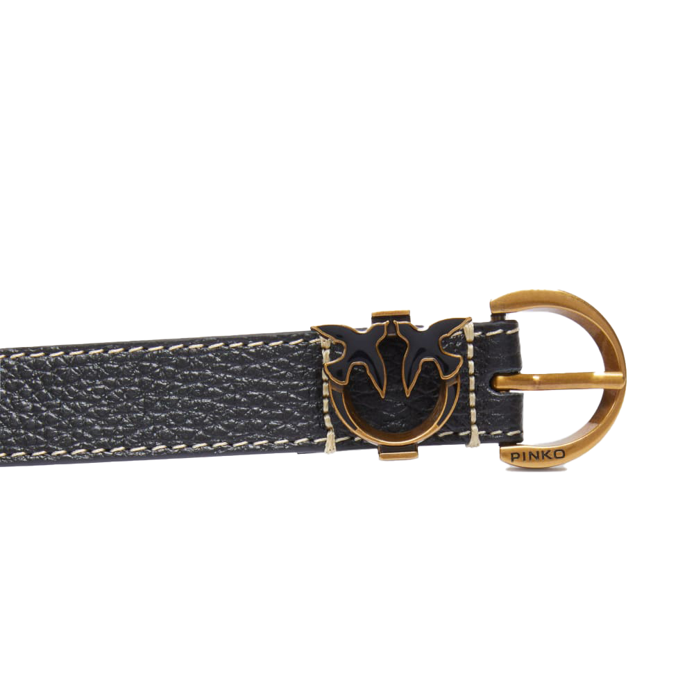 Uno degli elementi più caratteristici di questa cintura è la fibbia a mezzaluna in metallo dorato, che aggiunge un tocco di raffinatezza al design complessivo. La presenza del dettaglio Love Birds, simbolo iconico del brand, enfatizza l’identità di Pinko e conferisce un aspetto distintivo all’accessorio. La larghezza di 2,5 cm la rende sottile e discreta, ideale per sottolineare la silhouette senza risultare invasiva.