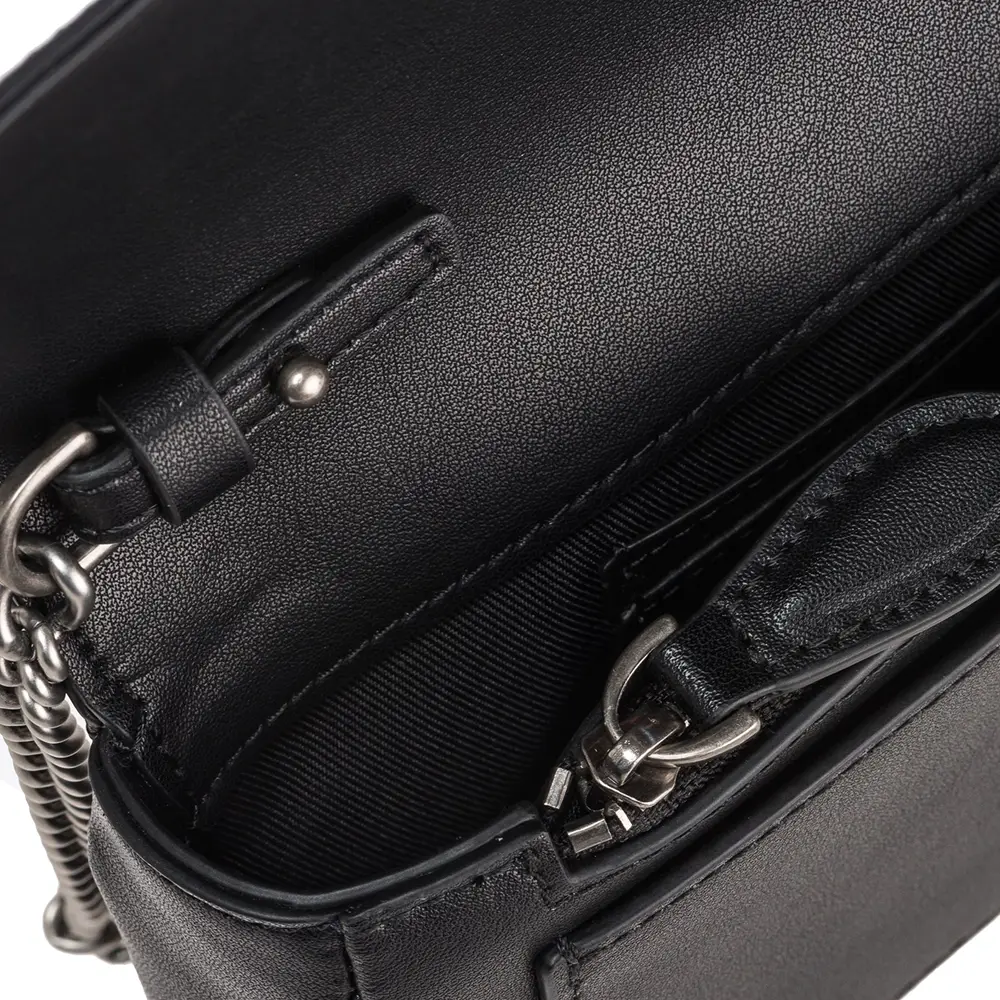 La tracolla rimovibile in catena di metallo rotonda, dalla lunghezza regolabile fino a 110 cm, aggiunge un tocco di glamour alla borsa, rendendola versatile da indossare a tracolla o a mano. La sua struttura, seppur compatta, offre due scomparti, una tasca piatta e una con chiusura a zip, per una maggiore organizzazione interna. Nonostante la mancanza di piedi sul fondo della borsa, la sua rigidità e qualità nei materiali garantiscono una buona stabilità.