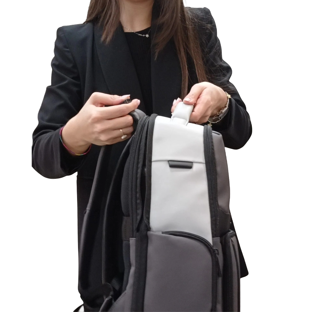 Zaino realizzato interamente in gomma impermeabile. Organizzato in due scomparti separati, entrambi con chiusura zip. Il primo scomparto é dedicato a due inserti imbottiti per tablet e computer. Il secondo scomparto, dotato di apertura totale, é dedicato al necessario per l’ufficio o per il viaggio. Esternamente é dotato di una tasca frontale con zip, di due tasche laterali porta bottiglia e porta ombrello, della tassia nascosta con protezione RFID e l’aggancio per il trolley nella parte posteriore. Completano lo zaino due spallacci imbottiti, regolabili e rifiniti in gomma e un manico superiore.