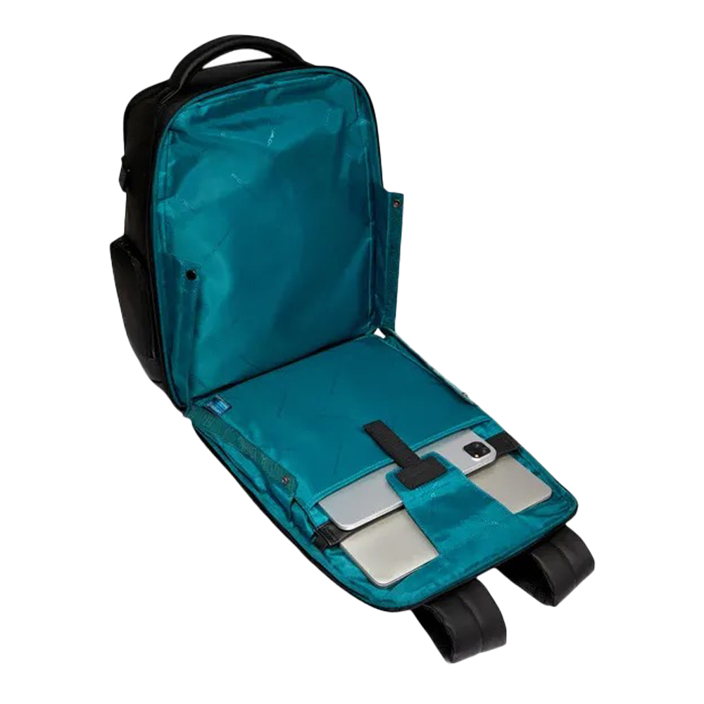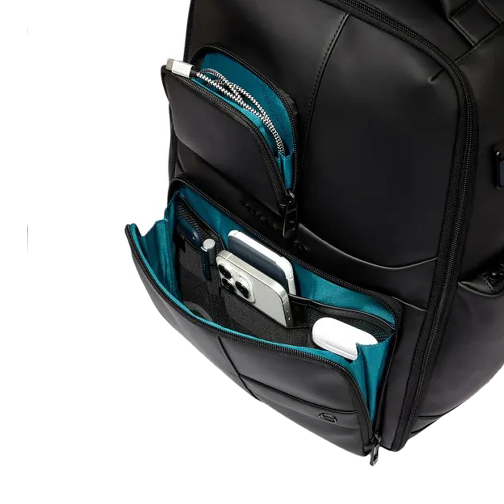 • Accessori: tasca dedicata per AirPods®, porta penne, porta cellulare, tasca per power bank con sistema di carica a induzione, porta occhiali con tasca, porta badge fisso.
