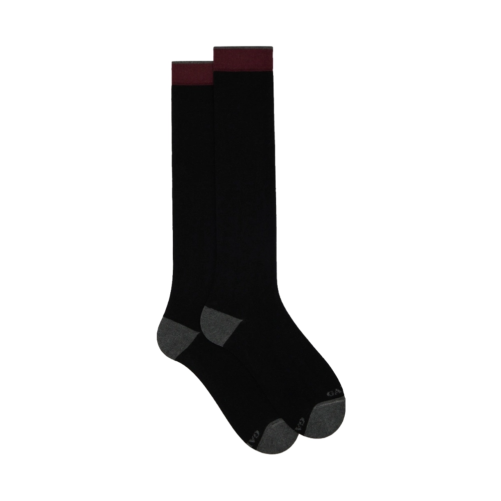 Calze lunghe da uomo realizzate in Italia con un blend di filati pregiati: cotone e cashmere. Molto morbide al tatto, create per una persona dinamica che non rinuncia ad un dettaglio di stile. La trama tinta unita nera le rende perfette per ogni tipo di look, formale o stravagante. La scritta Gallo è in punta a contrasto.