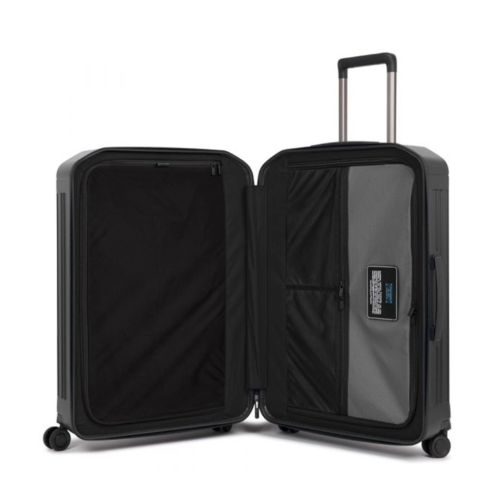 Trolley di media dimensione della collezione PQ-Light di Piquadro, realizzato in resistente policarbonato, dotato di apertura con cerniera e combinazione a tre cifre e TSA necessario per i viaggi in USA, doppio comparto interno con doppio divisorio.