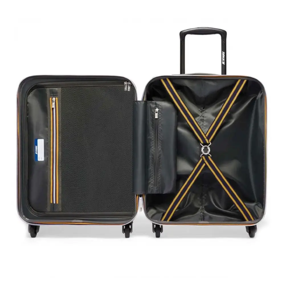 L’interno del trolley è foderato in poliestere con una stampa del logo K-Way in colore blu cobalto, aggiungendo un tocco di raffinatezza. Dispone di tre tasche con zip, ideali per riporre oggetti più piccoli o di valore, e di elastici incrociati multicolori ispirati all’iconico tape K-Way, che aiutano a mantenere gli indumenti in posizione durante il viaggio.