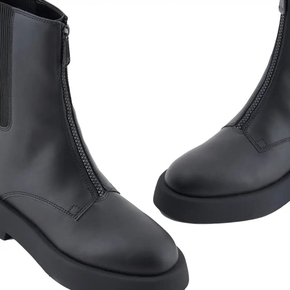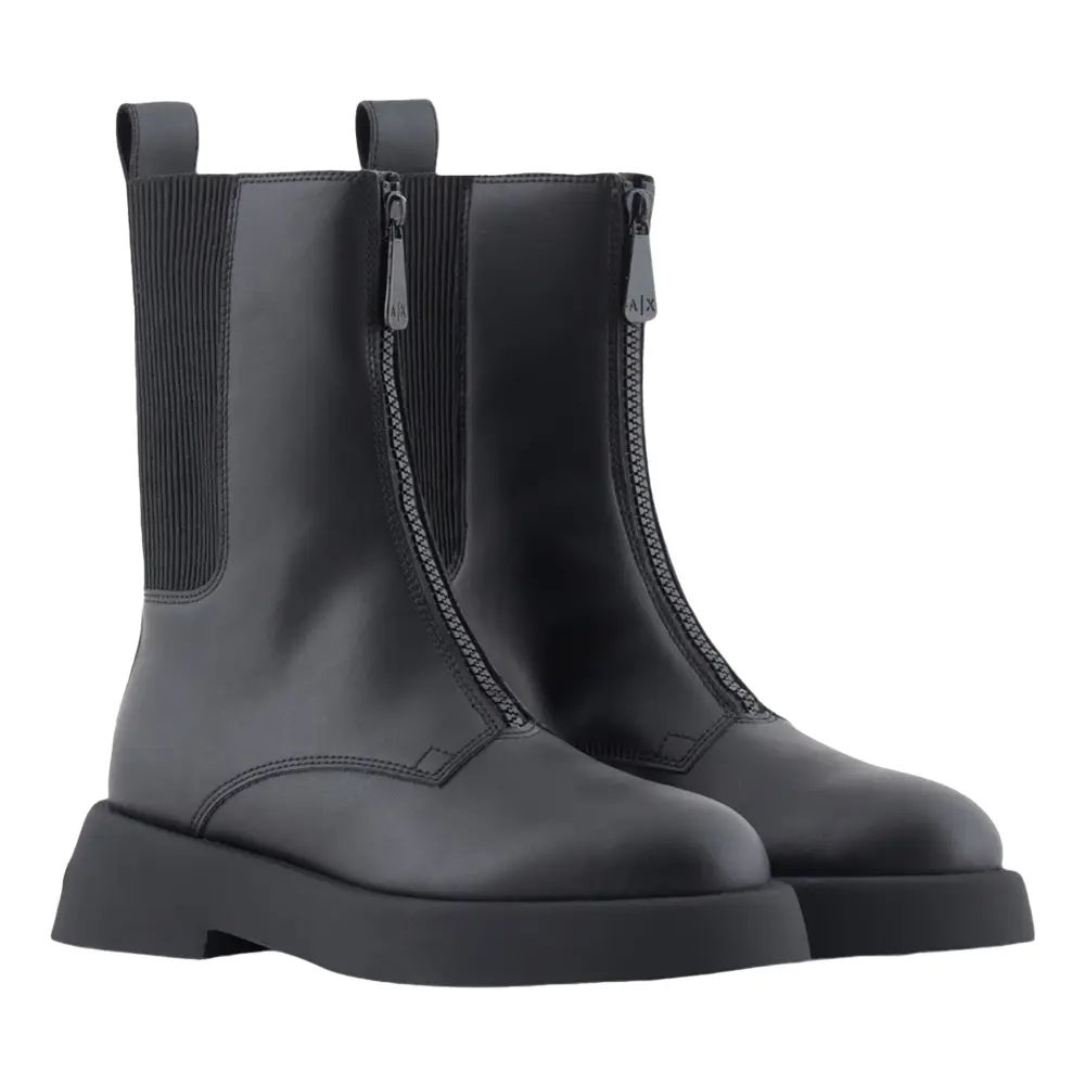 Gli stivaletti a metà polpaccio di Armani Exchange, modello Black Edition con chiusura frontale a cerniera, rappresentano una scelta perfetta per chi cerca un accessorio casual e raffinato, facile da indossare e dal design moderno. Progettati con una tomaia in pelle bovina di alta qualità, questi stivali combinano comfort e stile, grazie anche all’elemento elastico sul gambale che facilita la calzata e ne migliora l’aderenza.