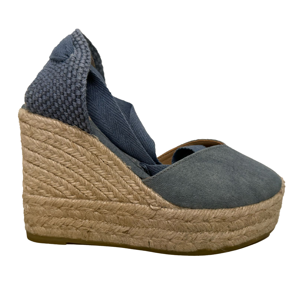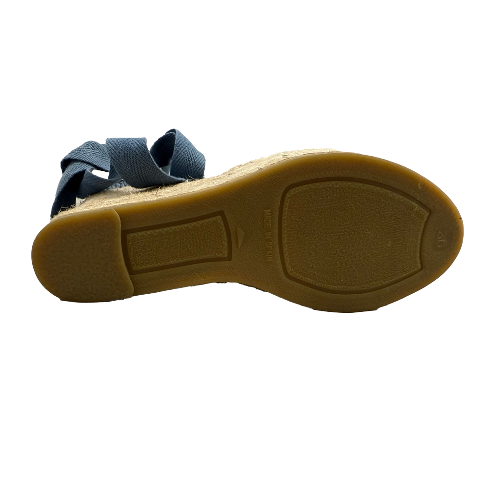 Le espadrillas in denim presentano una tomaia in tessuto jeans che conferisce un aspetto fresco e versatile. La suola in iuta intrecciata è un elemento distintivo, offrendo un tocco artigianale e una buona traspirabilità.