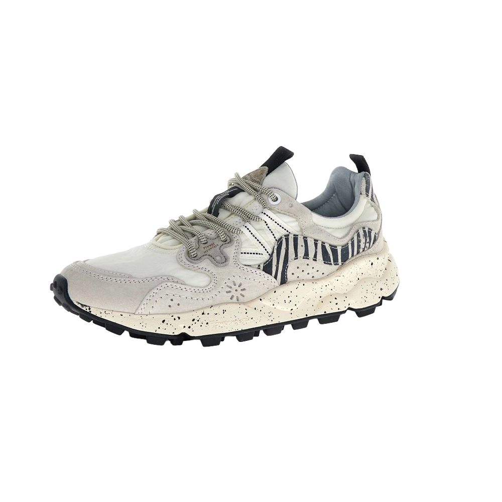 Sneaker Flower Mountain Yamano 3 da donna in tessuto tecnico e suede con inserti animalier zebra, dal perfetto equilibrio tra outdoor e stile fashion. Leggera, traspirante e dotata di soletta in sughero antibatterico e suola dentellata ultra leggera.