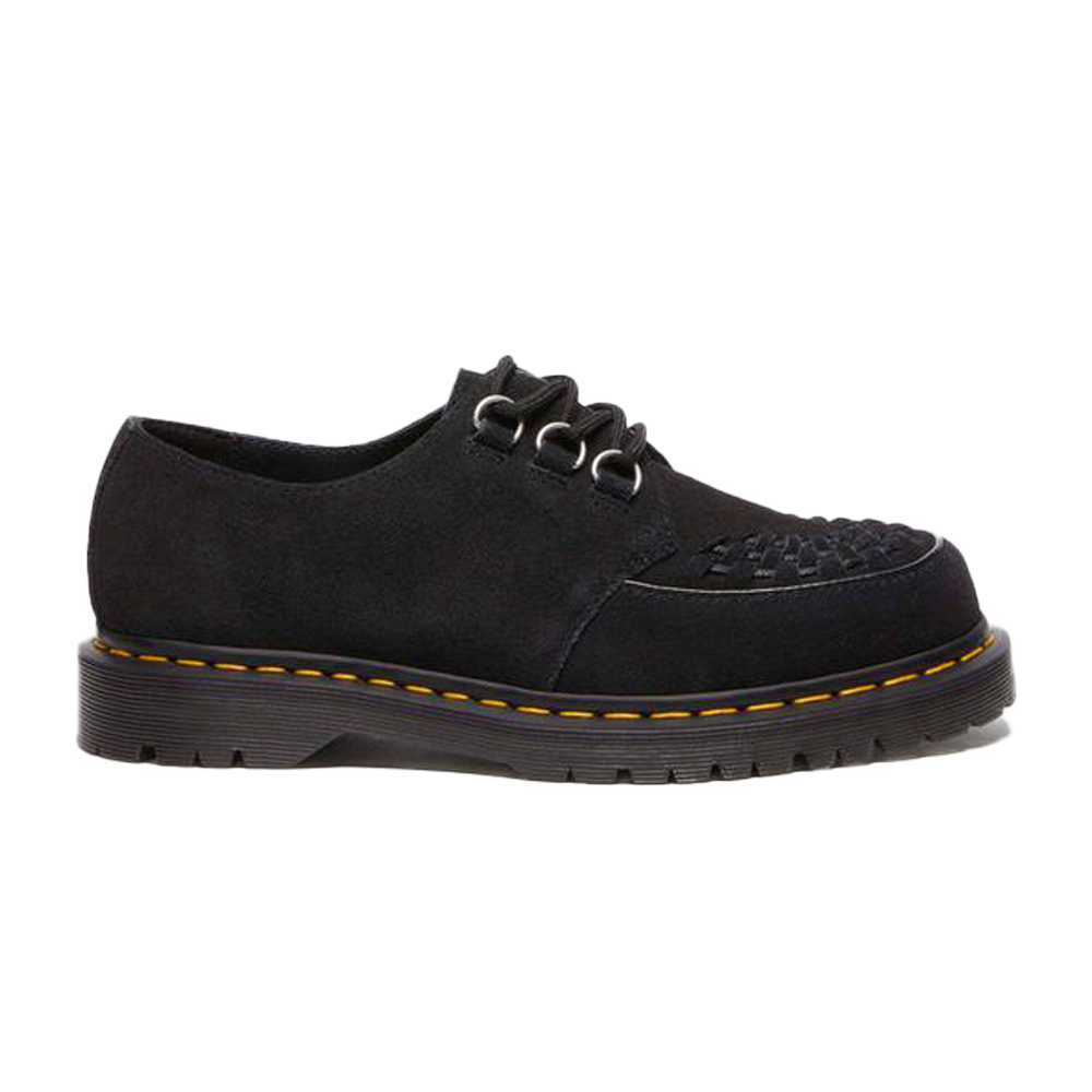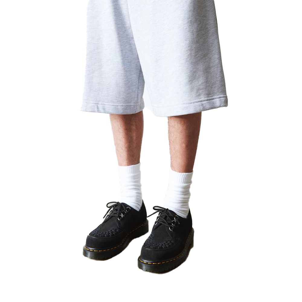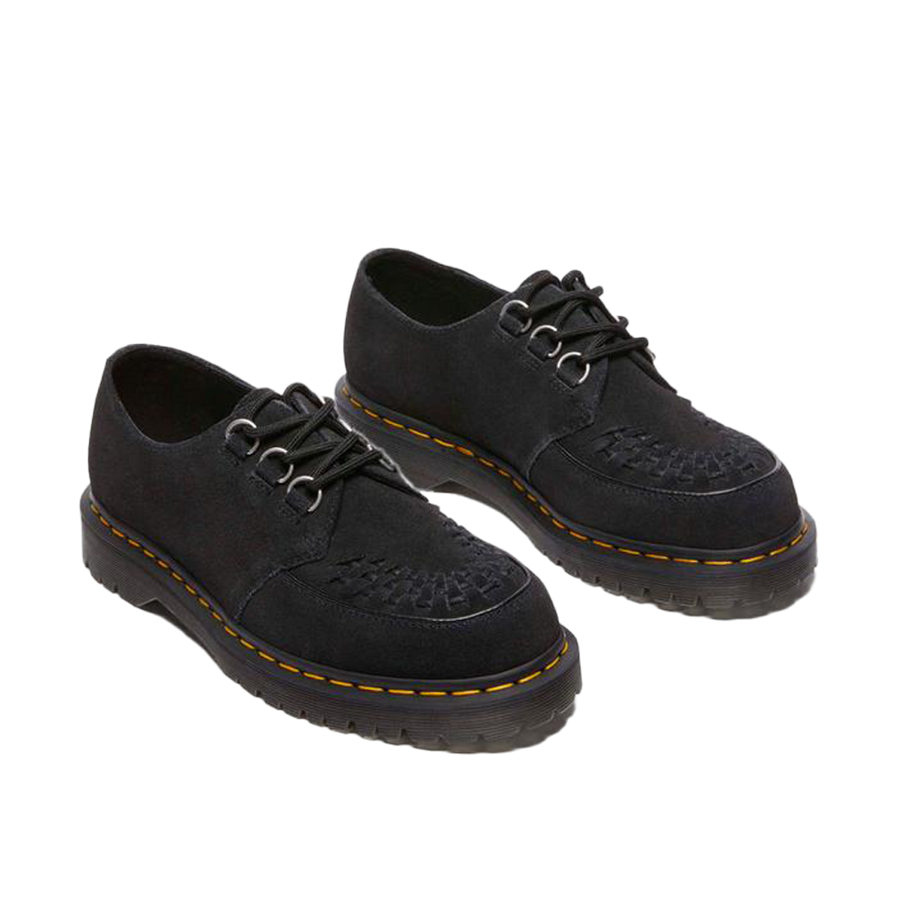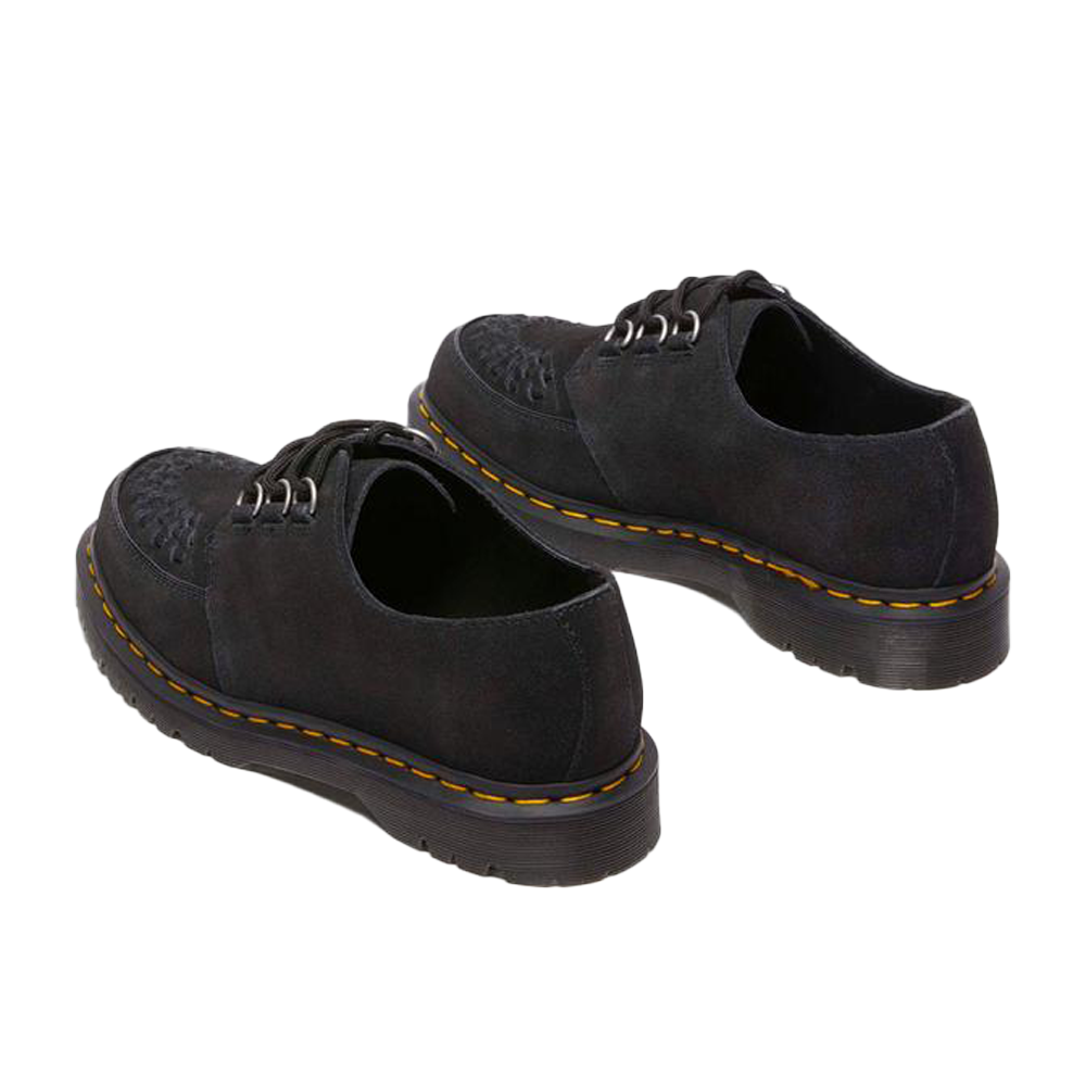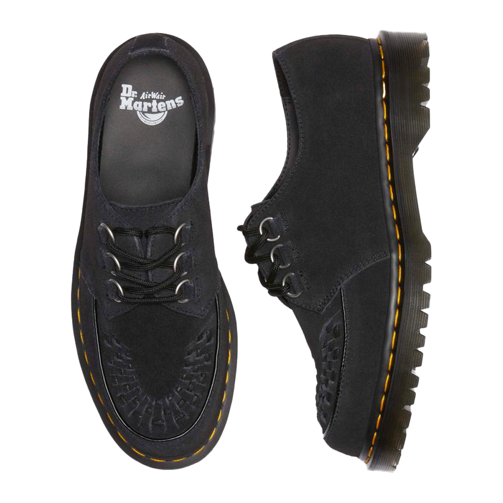 Le Dr. Martens Ramsey Black EH Suede rappresentano una fusione perfetta tra stile e funzionalità. Queste creepers sono realizzate in pregiato camoscio EH nero, offrendo una texture morbida e setosa al tatto. Il design distintivo presenta dettagli intrecciati sulla tomaia, richiamando l’estetica classica delle creepers. Inoltre, tre occhielli argentati ancorano saldamente i lacci, garantendo una calzata sicura e confortevole.