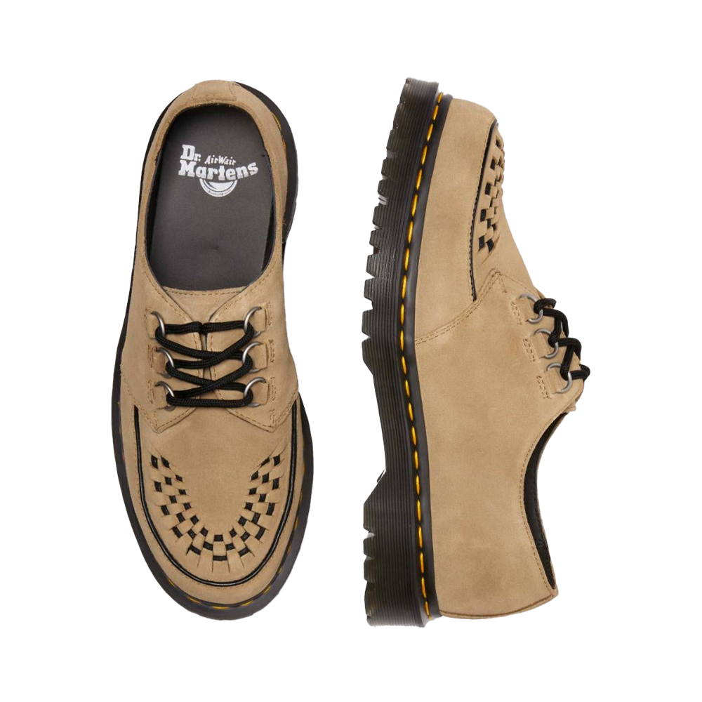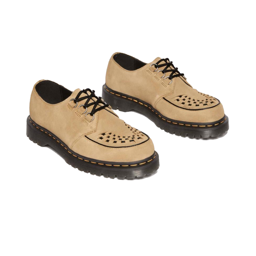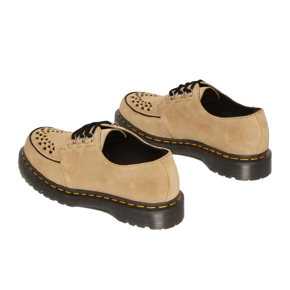 Le Dr. Martens Ramsey Savannah Tan EH Suede 40572200 rappresentano una fusione perfetta tra stile classico e materiali di alta qualità. Queste creepers sono realizzate in pelle scamosciata Desert Oasis nel colore Savannah Tan, offrendo una texture morbida e un aspetto raffinato. Il design distintivo presenta una frangia kiltie abbinata e dettagli intrecciati sulla tomaia, richiamando l’estetica tradizionale delle creepers. Inoltre, la chiusura Monk strap è assicurata da una fibbia in argento spazzolato, garantendo una calzata sicura e confortevole.
