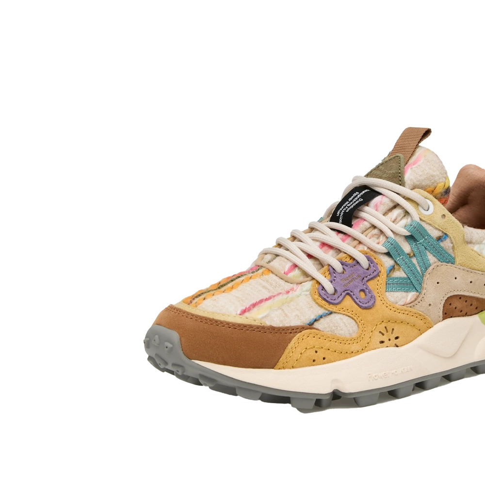 Sneaker in tessuto con tramatura multicolor e dettagli in suede. Chiusura con stringhe trekking e occhielli personalizzati. Fodera in tessuto con soletta interna in sughero naturale antibatterico. Fondo in gomma ultra leggera con battistrada dentellato.